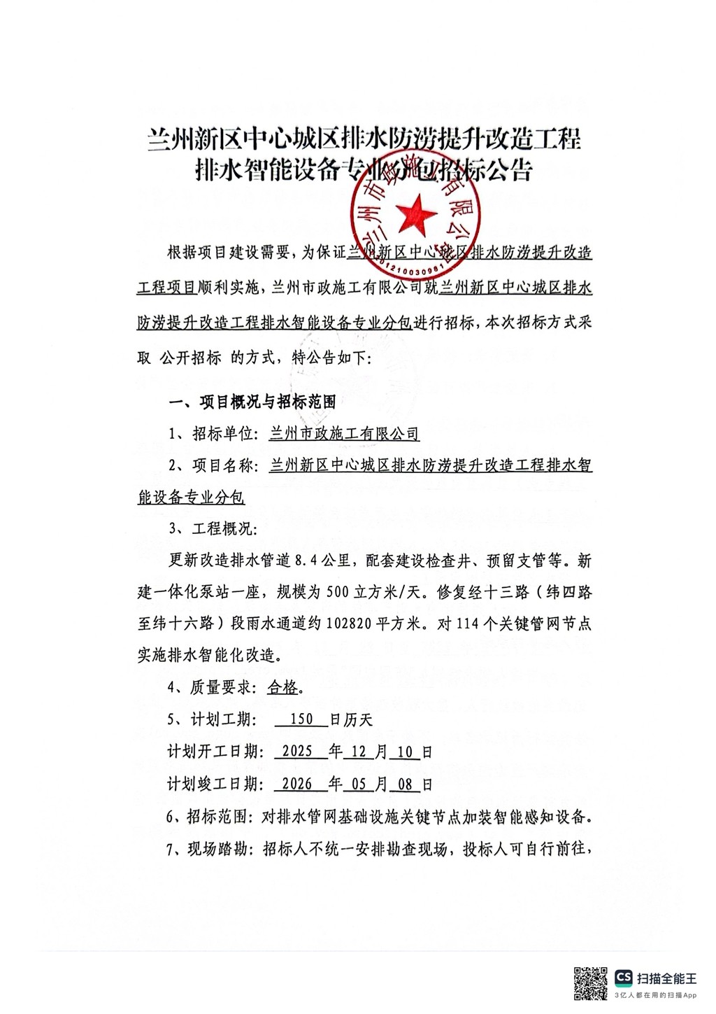 蘭州新區(qū)中心城區(qū)排水防澇提升改造工程排水智能設(shè)備專業(yè)分包招標(biāo)公告