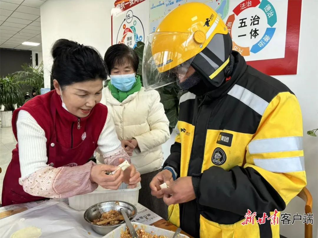12月19日下午,在位于蘭州新區(qū)京都商業(yè)廣場的新興領(lǐng)域區(qū)域性黨群服務(wù)中心,外賣配送員、網(wǎng)約車司機(jī)、快遞員等新就業(yè)群體和社區(qū)工作人員一起,包餃子、吃餃子,其樂融融。