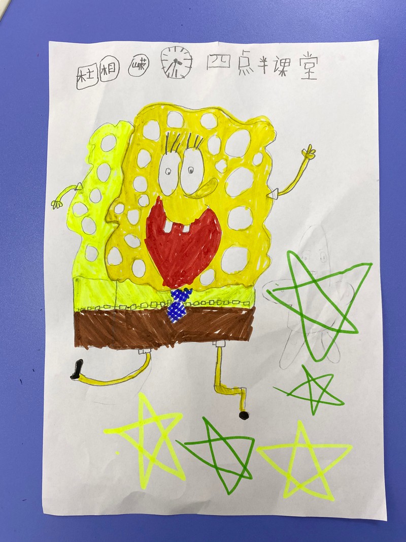 本次授課主要圍繞“海綿寶寶和派大星”進(jìn)行簡(jiǎn)筆卡通繪畫。通過講解示范讓小朋友們知道具體的繪畫步驟,在小朋友繪畫創(chuàng)作的同時(shí)進(jìn)行指導(dǎo)修改。不一會(huì)兒,一幅幅精美的作品就呈現(xiàn)在大家的眼前了。