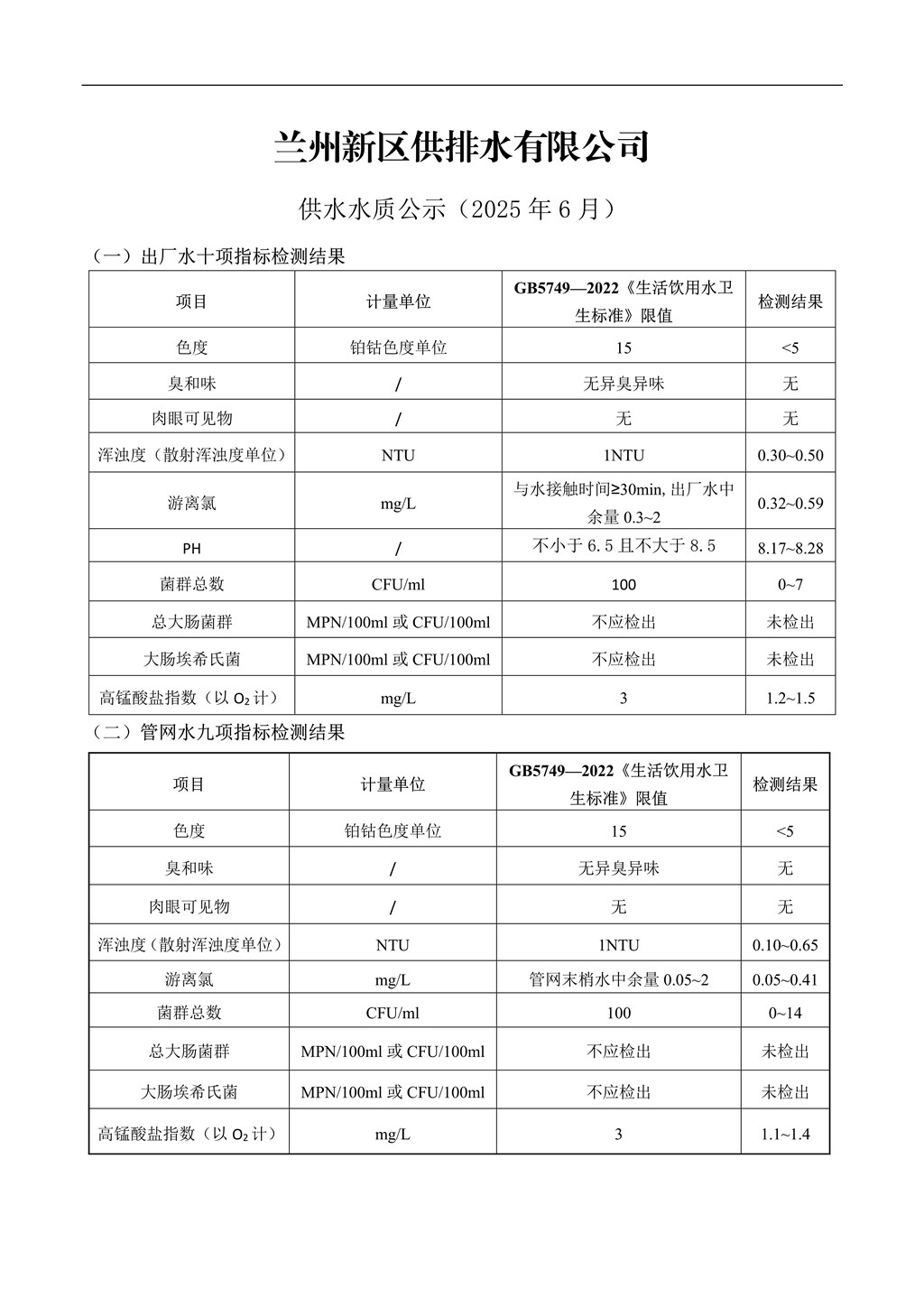 (2025年6月)蘭州新區(qū)供排水有限公司供水水質(zhì)公示