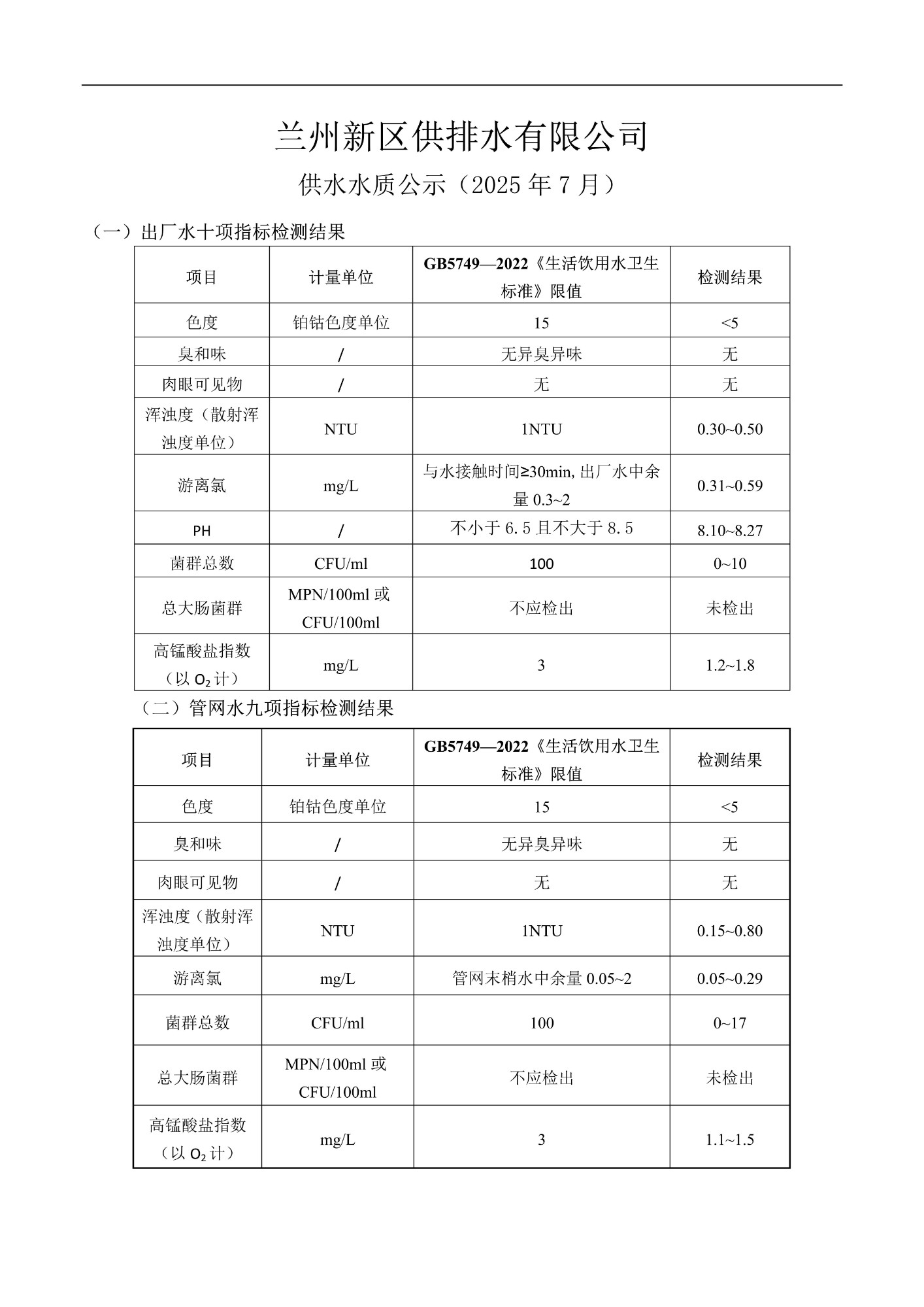 (2025年7月)蘭州新區(qū)供排水有限公司供水水質(zhì)公示